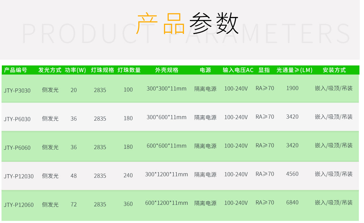 | 側發(fā)光 | 20 | 2835 | 100 | 300*300*11mm | 隔離電源 | 100-240V | RA≥70 | 1440 | 嵌入,吸頂,吊裝 | |