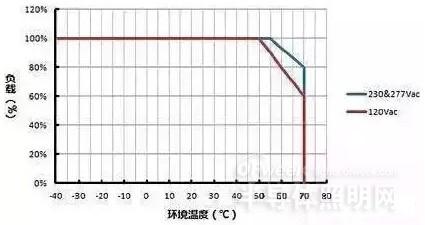 如圖 1 所示,紅色曲線表示 LED 驅動器在輸入 120Vac 情況下,其負載隨環境溫度變化的功率降額曲線。當環境溫度低于 50℃ 時,驅動器允許 100% 滿載,當環境溫度高達 70℃ 時,驅動器只能降額到 60% 的負載,當環境溫度在 50-70℃ 之間變化時,驅動器負載隨溫度上升而線性下降。