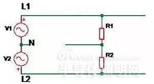 如上圖所示,V1 表示第一相電壓,V2表示第二相電壓,R1 及 R2 分別表示正常安裝到線路中的 LED 驅動器。當線路上零線(N)如圖斷開時,兩個支路上的驅動器 R1,R2 相當于串聯后接到 380Vac 電壓上。因為輸入內阻差異,當其中一個驅動器充電到啟動時,內阻變小,電壓可能大部分加到另外一個驅動器上,導致其過壓損壞失效。