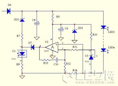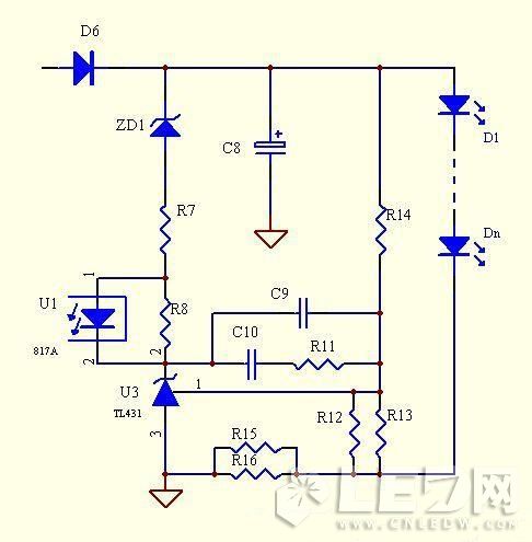原理:此電路同樣是利用了TL431的2.495V的基準來做恒流,跟上面的電路不同點在于減少了電流取樣電路的電壓,只要合計設計R12,R13,R14的值,可以限制LED上面的壓降.