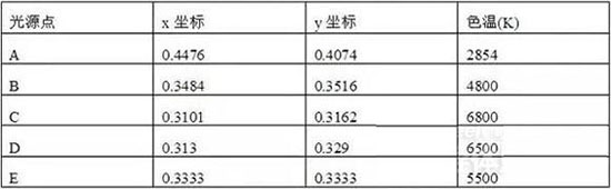 對于三原色紅(R)、綠(G)、藍(B),x=R/(R+G+B),y=G/(R+G+B),z=(R+G+B)。由于x+y+z=1,所以只需給出x和y的值,就能唯一確定一種顏色,這就是通常所說的色度圖。若以若以x、y作為平面坐標系,用比色實驗法測出自然界中各種色彩的x、y值,并將其繪在該坐標平面內,便可得到色度圖。該色度圖邊沿舌形曲線上的任一點都代表某一波長光的色調,而曲線內的任一點均表示人眼能看到的某一種混合光的顏色。其中,白光區域的特征點A.、B、C、D、E的色坐標值的色溫度值見下表。