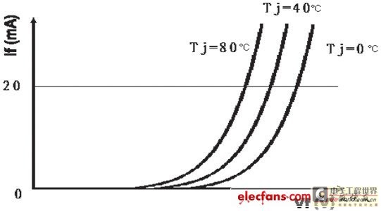 LED的伏安特性和其它二極管一樣具有負溫度系數的特點,即在結溫升高時I/V曲線出現左移現象,如下圖所示。