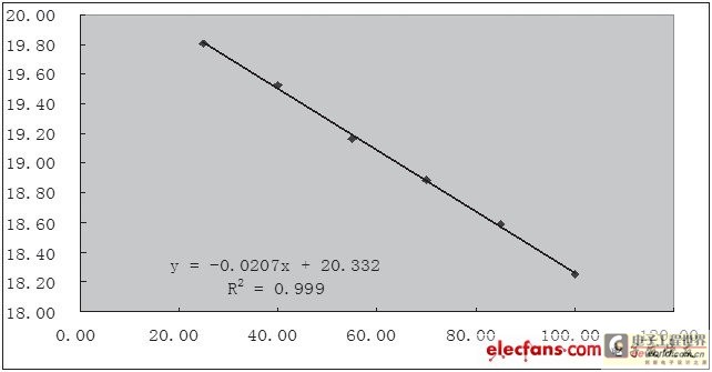 因測試時間較短,可以將測量時恒溫箱設置溫度近似等于LED光源的結溫。在600mA恒流的情況下,通過數學方法不難得出光源模塊正向電壓與結溫的關系。利用Excel工具,以溫度為X軸,平均值為Y軸,生成(X,Y)散點圖,選擇線性回歸分析類型則可生成如下趨勢圖和公式。