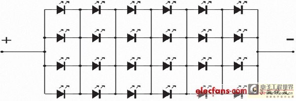 在實際應用中,往往不需要確定LED結溫的特別精確的數值,此時可以用試驗的方法確定整體燈具LED凈化燈光源結溫的估算數值。以一個12W筒燈為例,光源部分由4并6串中功率LED組成,其電路連接形式如下: