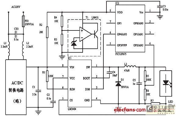 LM3404的輸出經R5、R6分壓后輸入PIC12F675的模擬端口AN2,PIC12F675經內部AD轉換、計算獲取LED光源的正向電壓,根據設定值程序產生PWM信號,通過GP4引腳接入LM3404的DIM端對其輸出功率進行調整。