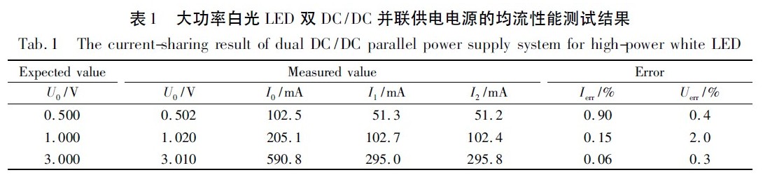由表1 可見,測得的實際電壓與設定值相比,3 次測量的誤差小于2%,兩支路電流的偏差小于1%,實現了很好的穩壓與均流效果。