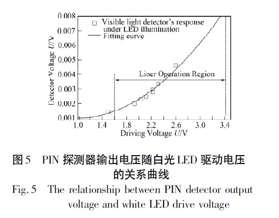 當白光LED 處于通信模式時,為保證通信質量,需要提供穩定、線性的驅動電壓。為驗證該供電系統的線性特性,將其用來驅動白光LED,同時使用可見光PIN 探測器測試了探測器的響應。實驗測得的PIN 探測器輸出電壓隨白光LED 驅動電壓的關系如圖5 所示。可以看出,當驅動電壓小于1. 6 V 時,白光LED凈化燈 進入非線性工作區。因此,當將該供電電源驅動白光LED凈化燈 進行可見光通信時,應使其輸出電壓( 亦即Bias-Tee 的直流輸入電壓) 調整至線性區中間點( 亦稱為線性工作點) ,約為2.7 V.