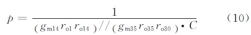 其中,gm為輸入差分對管的跨導,//代表電阻并聯,gm14和gm35分別為晶體管MN14和MP35的跨導,ro1,ro14,ro35,ro30分別為差分輸入對管和MN14,MP35,MP30的輸出電阻。