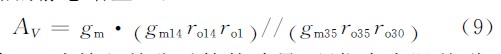 從圖4可以看到,電路為單級折疊式共源共柵結構,這種結構有很高的輸出電阻,保證了電路的高電壓增益。結合模擬集成電路的基本知識,可得到電路的靜態增益: