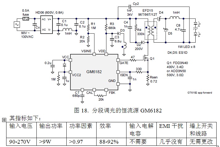 為了利用現(xiàn)有的墻上開(kāi)關(guān)和墻內(nèi)的兩根線,臺(tái)灣有一家公司推出了一種稱(chēng)之為EZ-Dimming的GM6182的四段開(kāi)關(guān)調(diào)光不失為一種好方案。它只利用墻上的普通電燈開(kāi)關(guān)就能實(shí)現(xiàn)4段調(diào)光,第一次開(kāi)為全亮,第二次快速開(kāi)關(guān)為60%亮度,第三次快速開(kāi)關(guān)為40%亮度,第四次快速開(kāi)關(guān)為20%亮度。這種系統(tǒng)的優(yōu)點(diǎn)是可以利用普通的墻上開(kāi)關(guān)實(shí)現(xiàn)調(diào)光。而且其功率因素高達(dá)0.92以上。沒(méi)有產(chǎn)生干擾信號(hào)之慮。缺點(diǎn)是無(wú)法連續(xù)調(diào)光。還有操作麻煩一些。它實(shí)際上可以和恒流源設(shè)計(jì)在一起(圖18)。