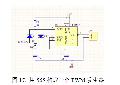 具體獲得PWM信號(hào)的方法為在墻上的PWM開(kāi)關(guān)和電位器里安裝一個(gè)PWM發(fā)生器。這個(gè)PWM發(fā)生器可以很容易地用一個(gè)555芯片形成(圖17)。
