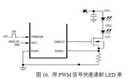 具體實(shí)現(xiàn)PWM調(diào)光的方法就是在LED的負(fù)載中串入一個(gè)MOS開(kāi)關(guān)管(圖16),這串LED的陽(yáng)極用一個(gè)恒流源供電。